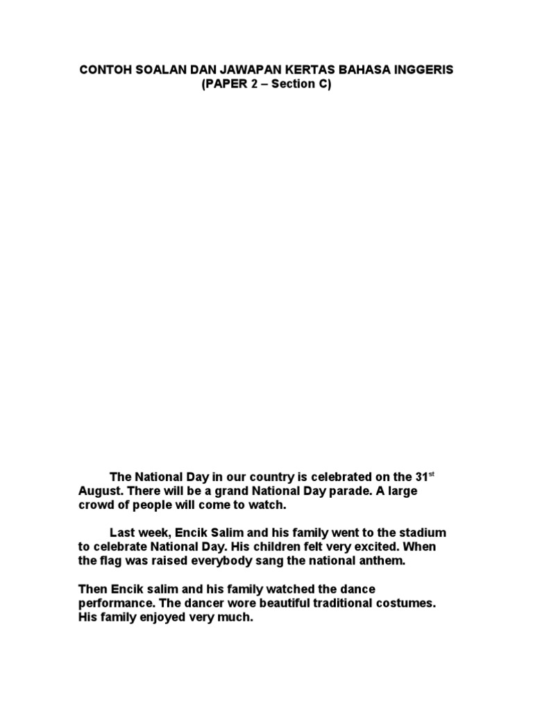 Berikut merupakan contoh. CONTOH SOALAN DAN JAWAPAN KERTAS BAHASA INGGERISPAPER 2 Section C During the holidays Encik Ali took his family to PulauLangkawi. Bahagian A dan Bahagian B.